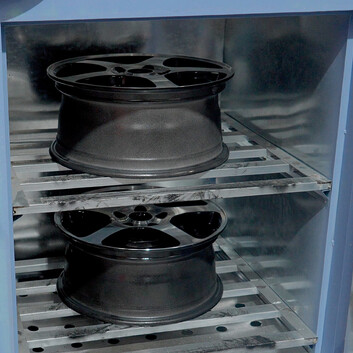 The coating itself takes just 17 seconds. After that, wheels cure in the oven for 15 minutes at 180°C (the oven can bake 4 wheels at once).